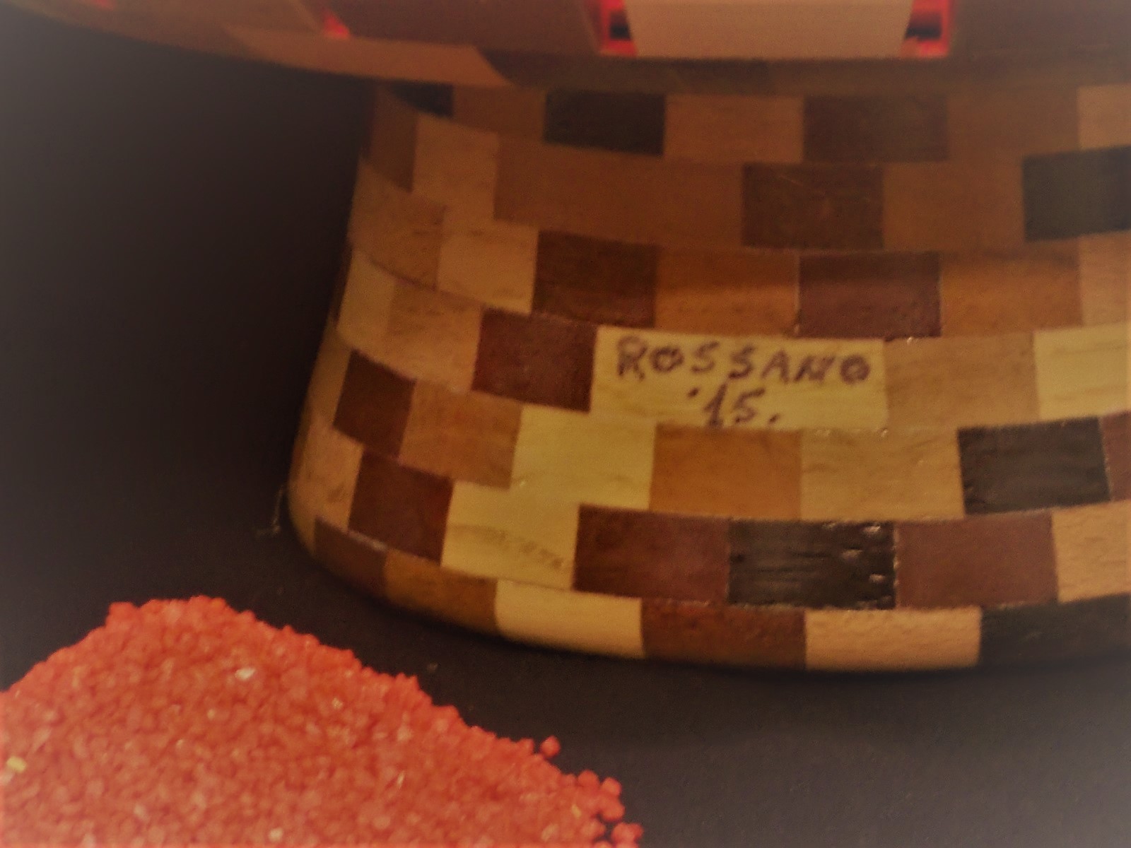 interno della lampada dove sono alloggiati i due trasformatoriinserimento del dispositivo che fa funzionare il magnetecopertura in plexiglas con foro di uscita del puntatore lasermagnetecoprimagnete in legno con luce al suo internolampada composta da quasi 1000 pezzi e 5 qualità di legni duri