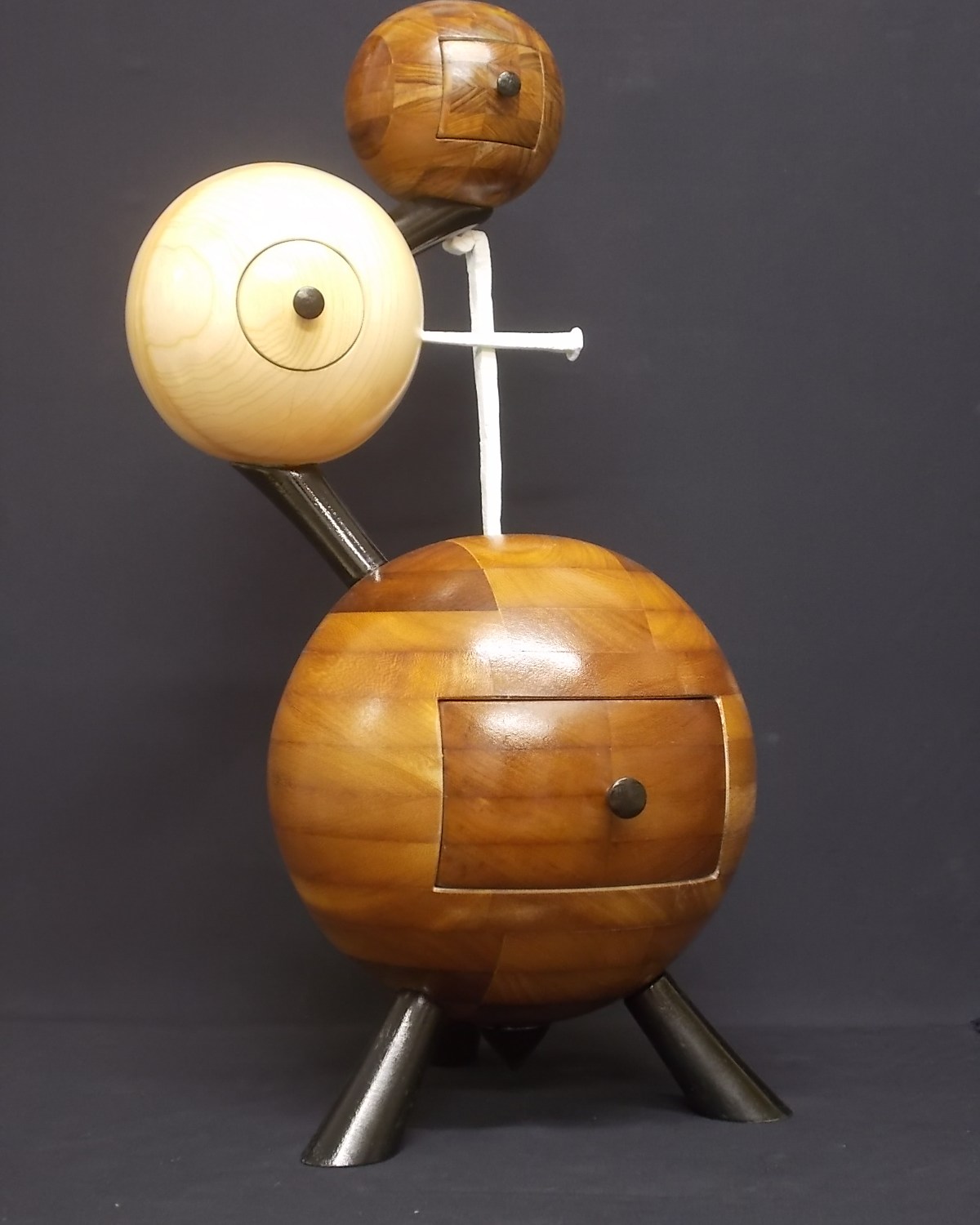 Tornitura di 3 sfere:la grande è fatta in doussie con all’ interno un cassetto ,la sfera centrale di frassino ha un cassetto cilindrico,e quello più piccolo è in teak .