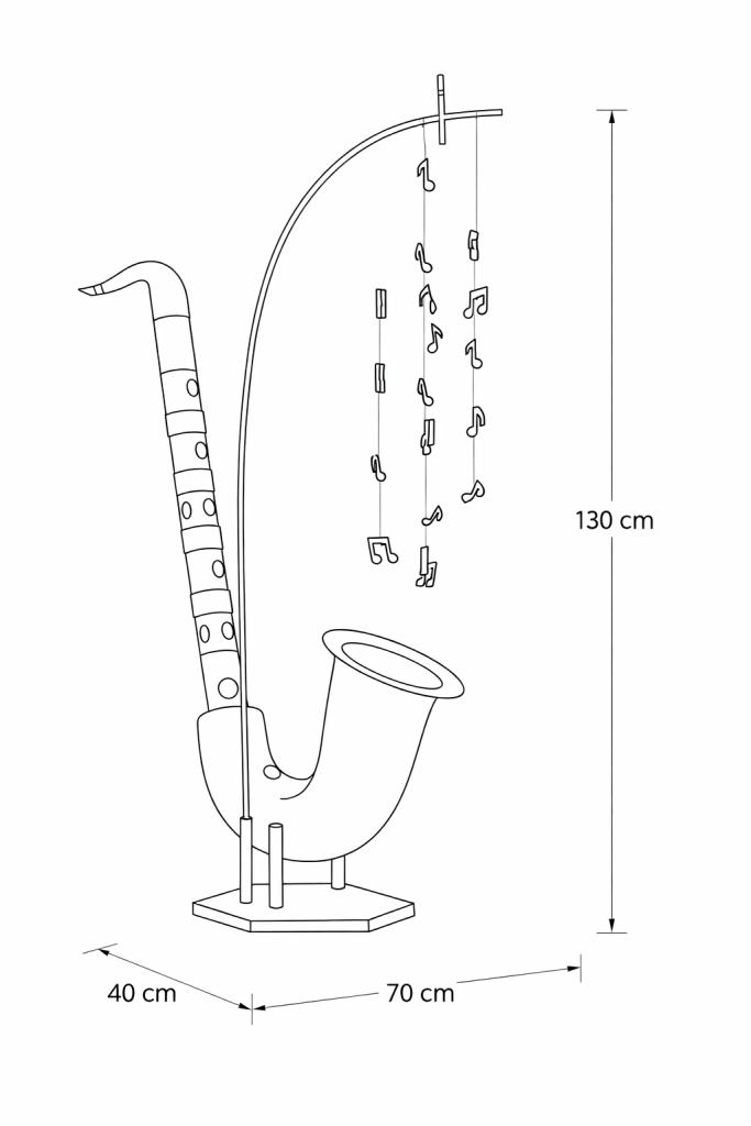 - Design: L’asta curva funge da supporto e da cui pendono diverse sagome di note musicali, aggiungendo un tema decorativo legato alla musica. La campana del sassofono in legno ospita la fonte di luce principale.
