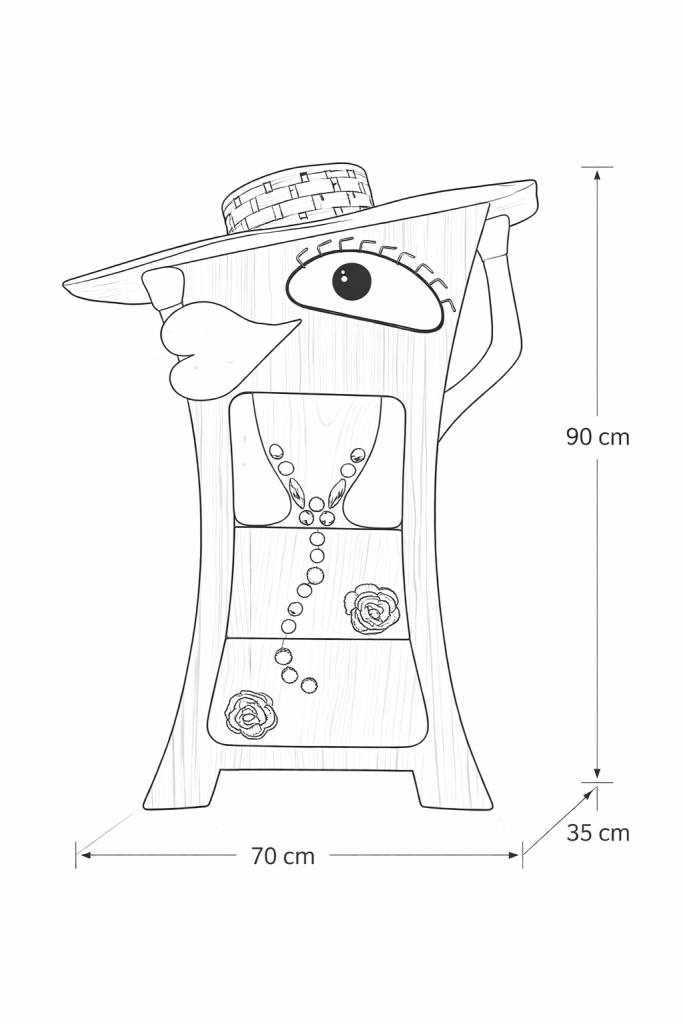 - Design Antropomorfo: Il mobile ha la forma di una figura umana o di un personaggio stilizzato, completo di cappello, baffi, occhi e abiti che fungono da cassetti.