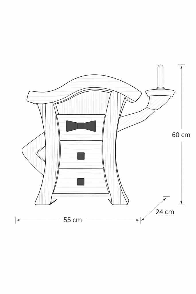 Si tratta di un mobiletto in legno dal design antropomorfo e unico, che funge anche da lampada integrata. L’oggetto è caratterizzato da forme curve, venature del legno contrastanti e un dettaglio a papillon sul cassetto superiore.