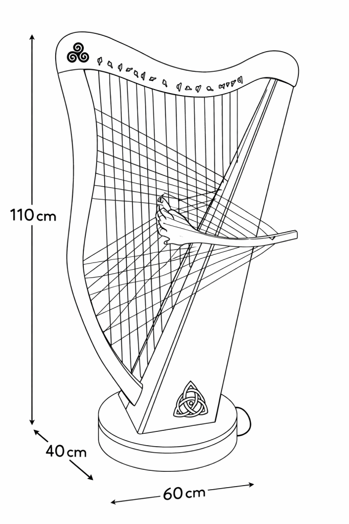 - Dettagli Aggiuntivi: Si notano intagli decorativi sul telaio, come il simbolo in alto a sinistra e un nodo celtico alla base, che sono elementi comuni nelle arpe di ispirazione celtica.