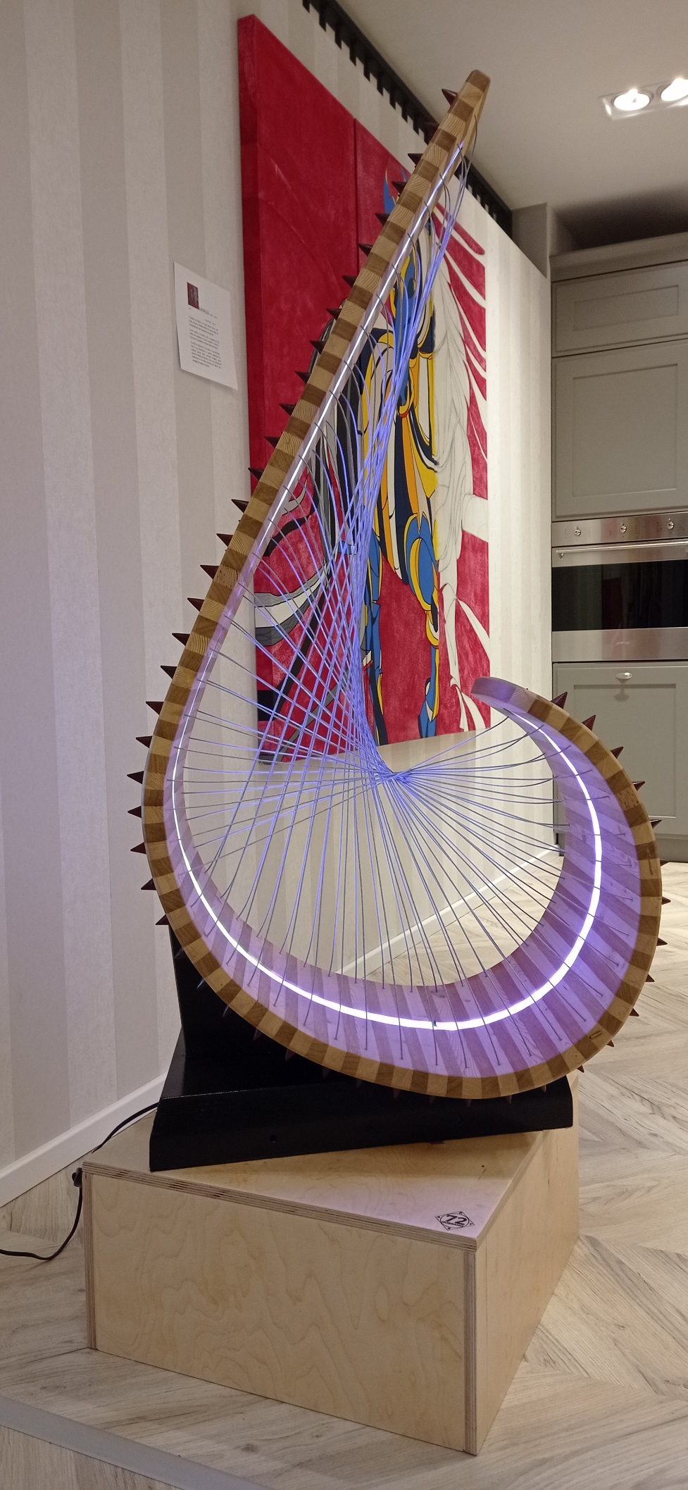 Lampada dalla forma ad onda spinosa ,realizzata in legno di rovere e larice. 50 cavi in acciaio gli danno una tensione ed i led gli conferiscono luminosità insolità.