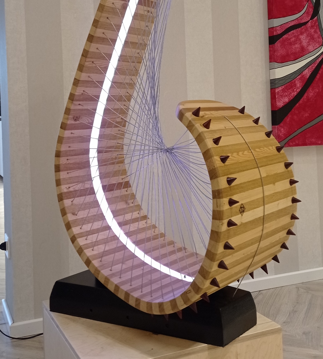 Lampada dalla forma ad onda spinosa ,realizzata in legno di rovere e larice. 50 cavi in acciaio gli danno una tensione ed i led gli conferiscono luminosità insolità.