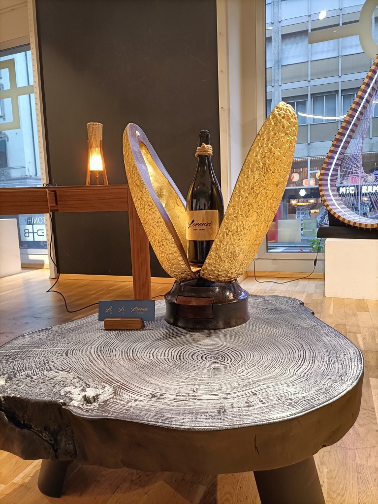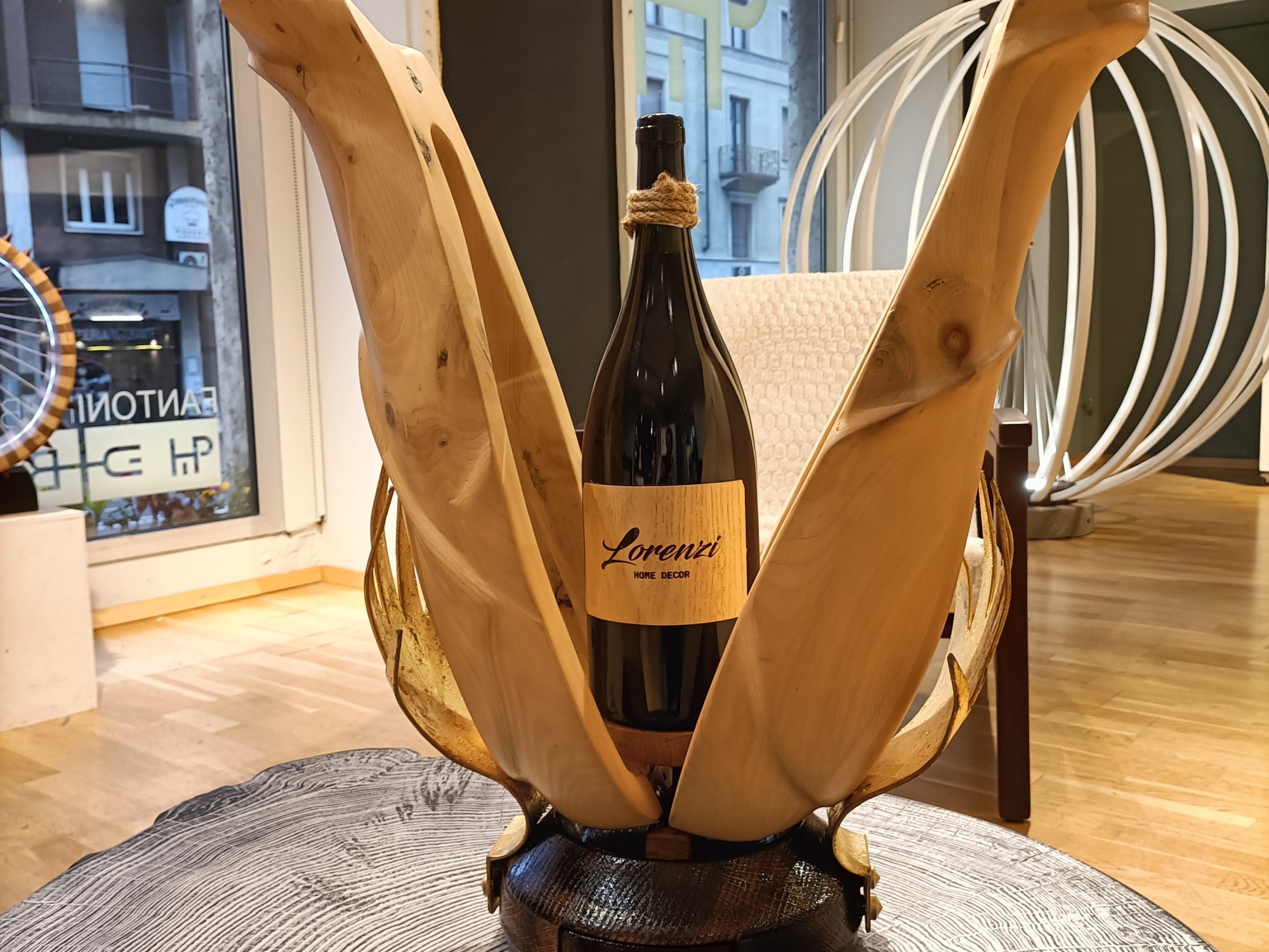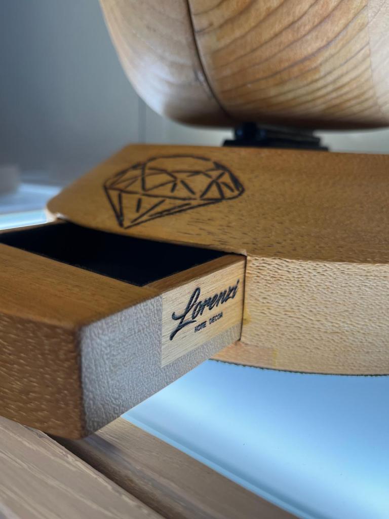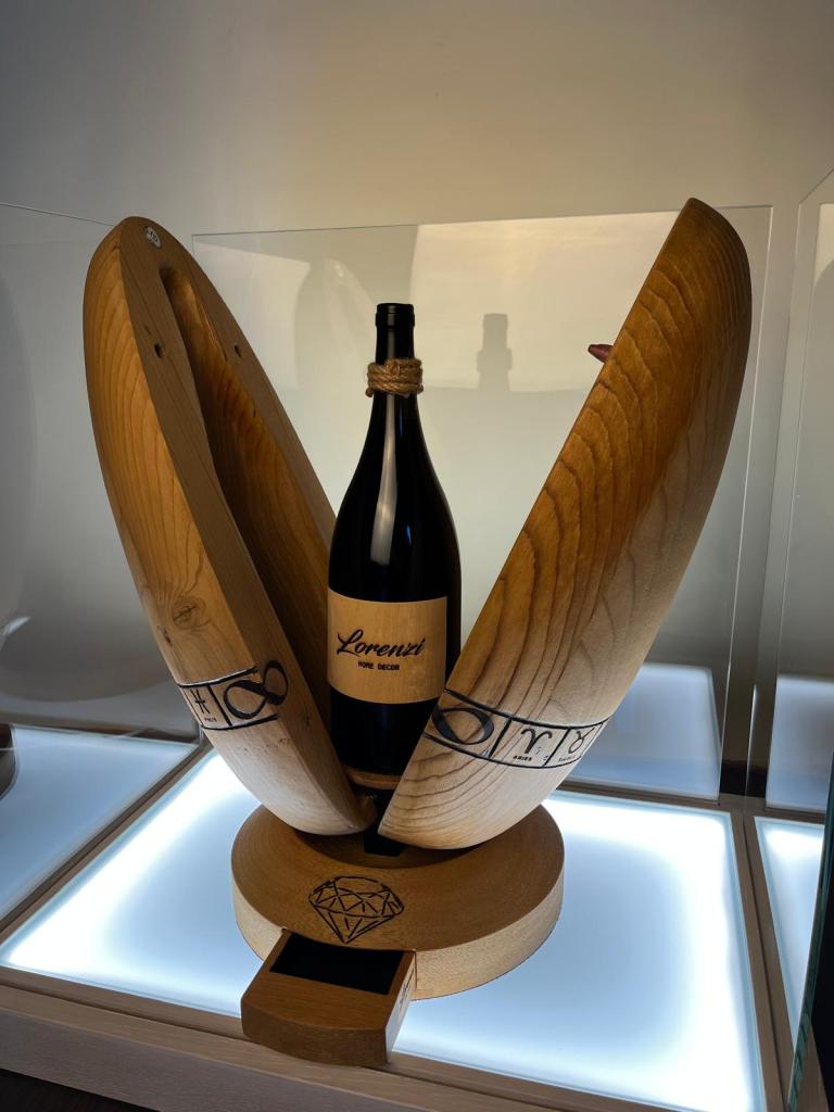 Espositore per bottiglie di vino da 1,5l , realizzato in legno di cedro con decori incisi a fuoco .Nella base si trova un cassettino porta gioie .