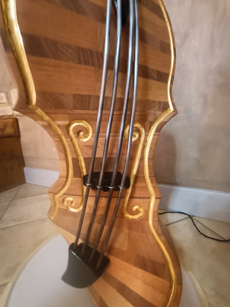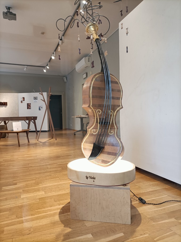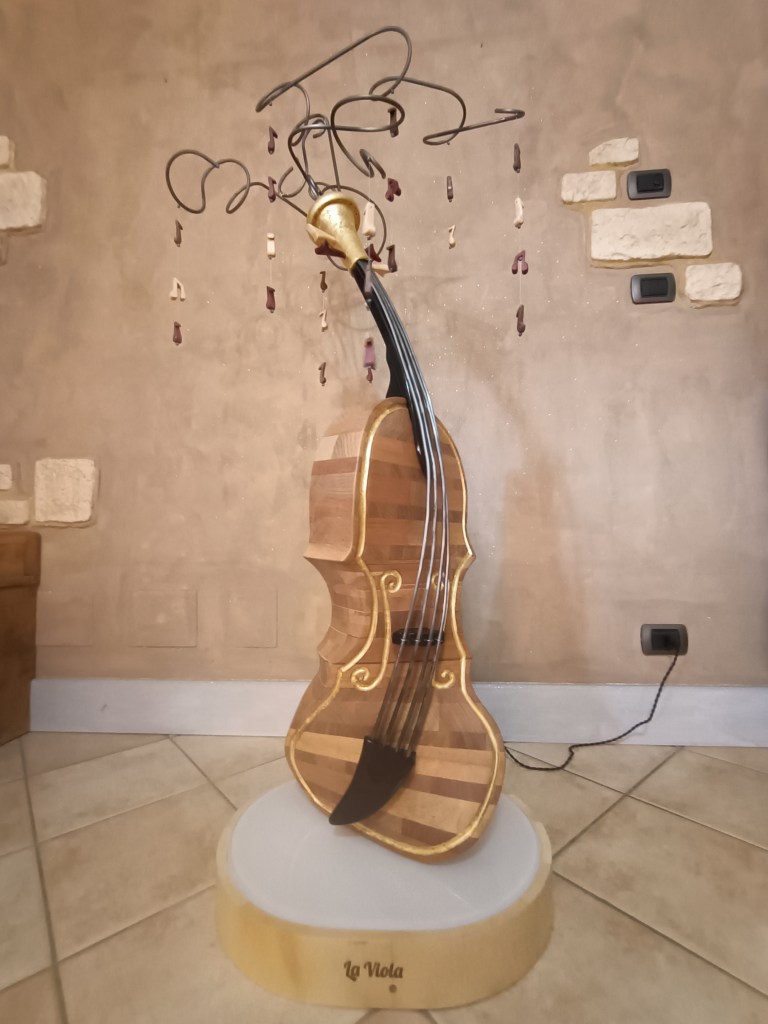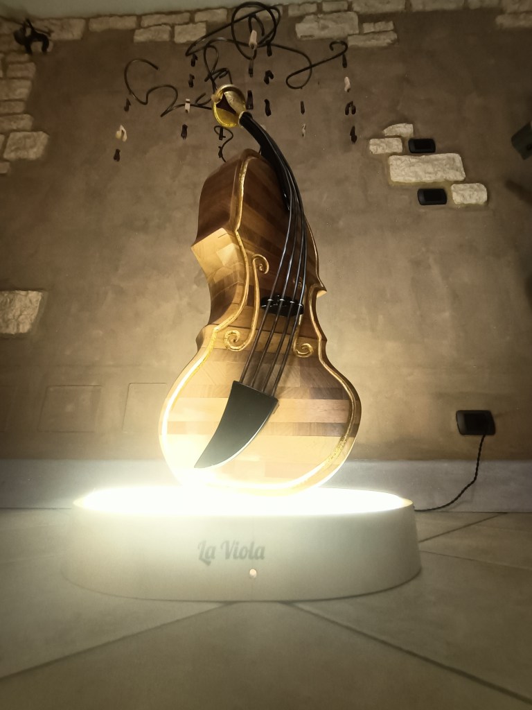 Questo è un oggetto da collezione, specificamente una lampada scultura chiamata “La Viola”. È realizzata in mogano, con inserti in wengé e decorazioni in foglia d’oro, ed è una creazione unica .
