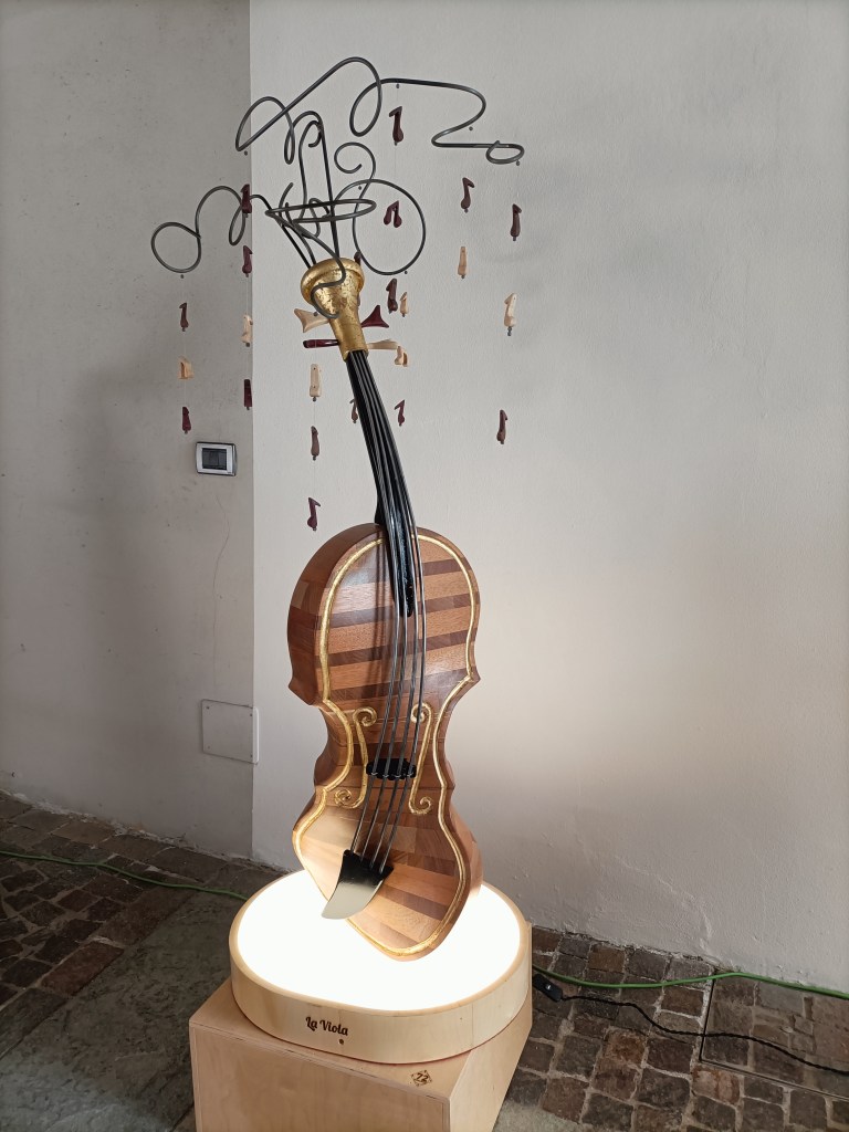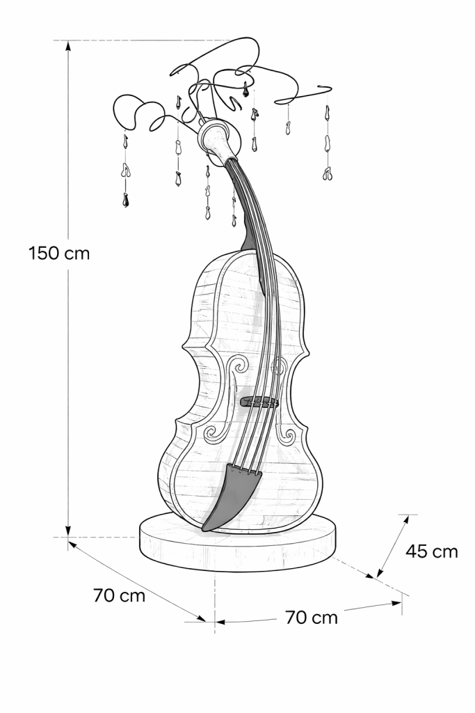 Design: La scultura in torsione presenta una “pioggia di note” che scendono dall’alto.