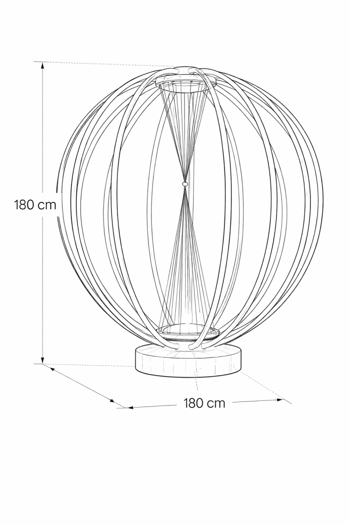 - Design Unico: La struttura è composta da una gabbia sferica di anelli bianchi che convergono verso il centro e la base.