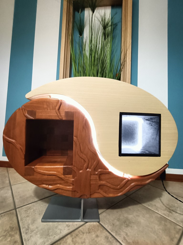 Mobile lampada fatto in massello di mogano e frassino con due riquadri porta oggetti