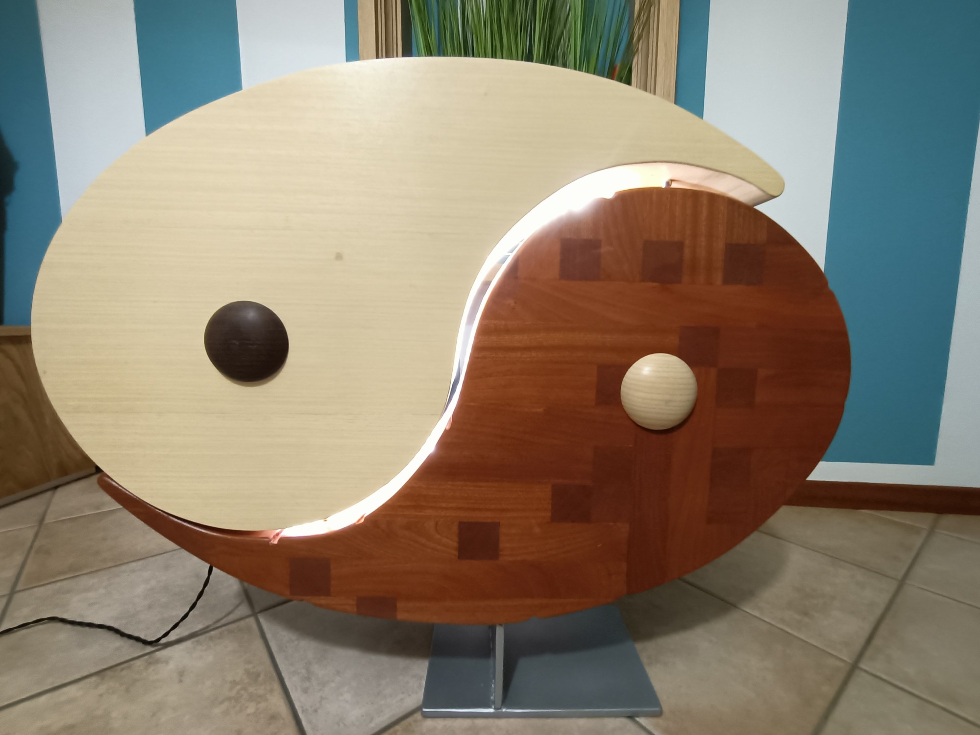 Mobile lampada fatto in massello di mogano e frassino con due riquadri porta oggetti